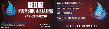 Call Jay Morgenroth with Reddz Plumbing & Heating. Reddz Plumbing & Heating Service has over 40 years experience in the plumbing and heating industry. If you need a bathroom/kitchen remodel, water heater replacement, all water treatment, or just a small leak that needs repaired, Reddz Plumbing & Heating Service is your company. Offering great service at affordable rates. Servicing Lancaster, and all surrounding areas.
